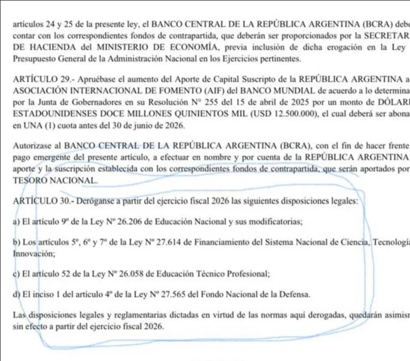 Además, el anteproyecto incluye la derogación del artículo 9º de la Ley de Educación Nacional, que establecía un piso del 6% del PBI destinado a educación, y elimina las metas de financiamiento progresivo en ciencia y tecnología.