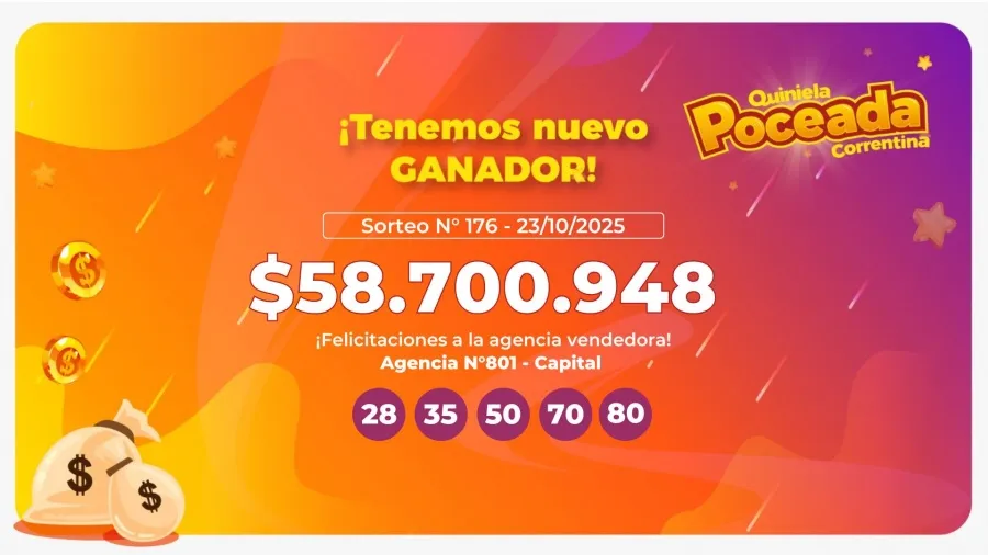 LOTERÍA CORRENTINA. La suerte volvió a sonreír en Corrientes Capital. En el sorteo del pasado jueves, un apostador logró acertar los cinco números de la Quiniela Poceada Correntina y se llevó más de 58 millones de pesos.