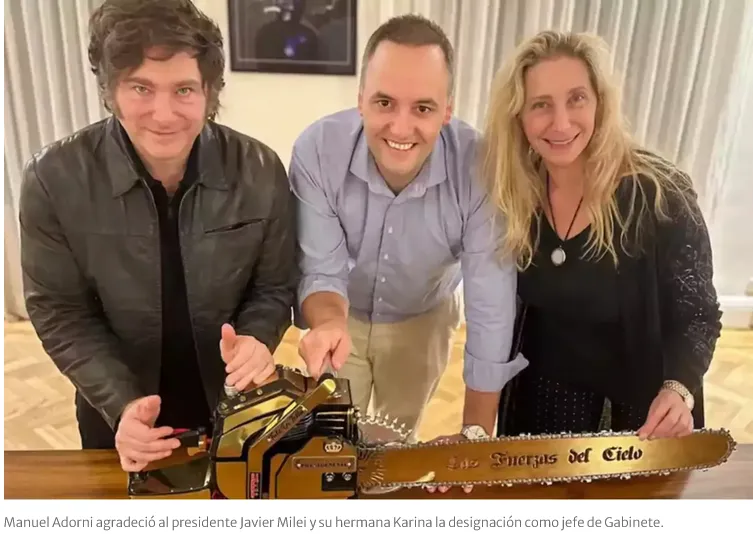 Por su parte, la Oficina del Presidente anunció que Adorni asumirá como jefe de Gabinete el próximo lunes y explicó que su designación en el cargo "responde al resultado de las elecciones, la necesidad de renovar el diálogo político y esta segunda etapa que comienza el 10 de diciembre enfocada en las reformas estructurales que el país necesita".