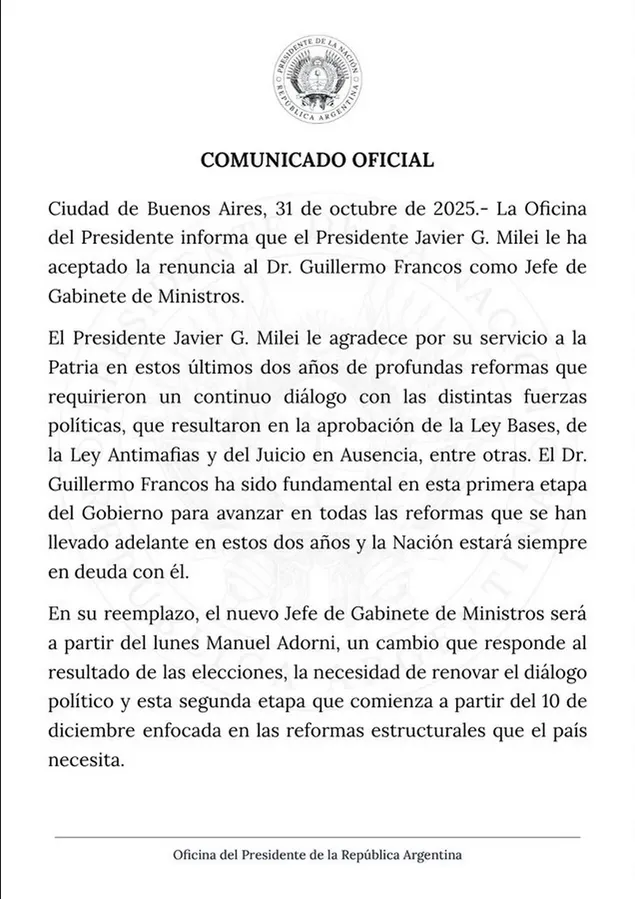 “Ante los persistentes trascendidos sobre modificaciones en el Gabinete Nacional, me dirijo a Usted con el objeto de presentarle mi renuncia al cargo de Jefe de Gabinete de Ministros, para que pueda afrontar sin condicionamientos la etapa de gobierno que se inicia luego de las elecciones nacionales del pasado 26 de octubre”, sostuvo Francos en su cuenta de X.