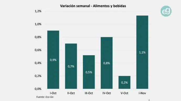 En tanto, en la primera semana de noviembre, los alimentos consumidos dentro del hogar registraron una suba del 1,1%, marcando una aceleración de 0,9 puntos porcentuales respecto a lo registrado la semana previa, según lo indicó Eco Go, consultora que realiza su propio análsis sobre el aumento en el precio de los alimentos, aunque con una semana de rezago.